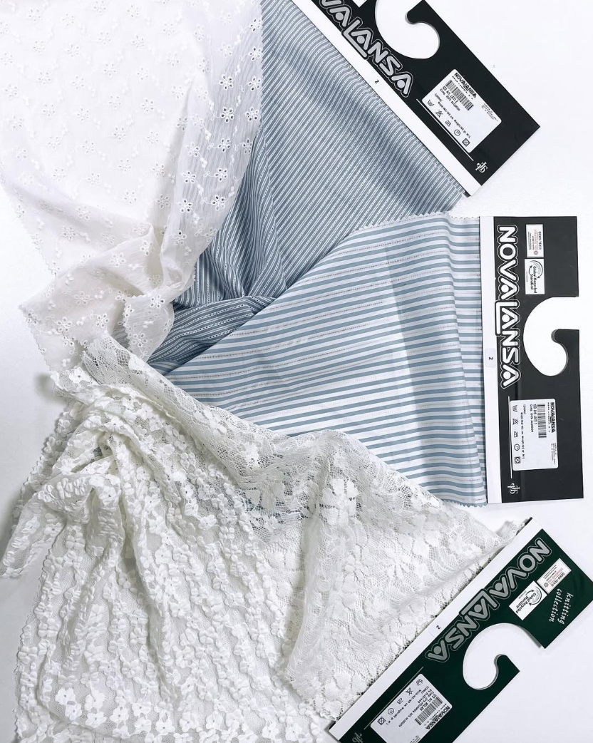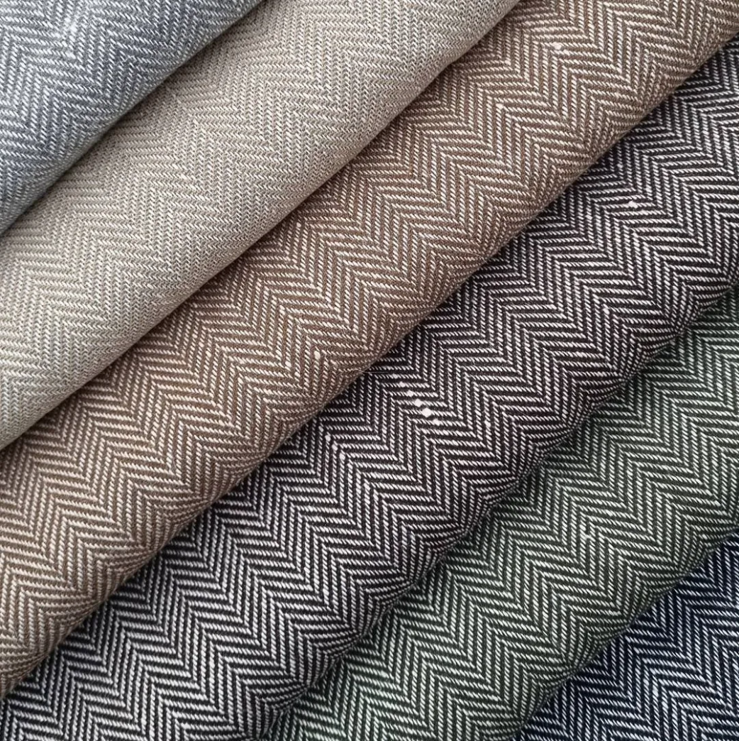 Womenswear ranges of cotton, linen and viscose blends as well as fancy jacquards in organic composition moxed with synthetic fibres.